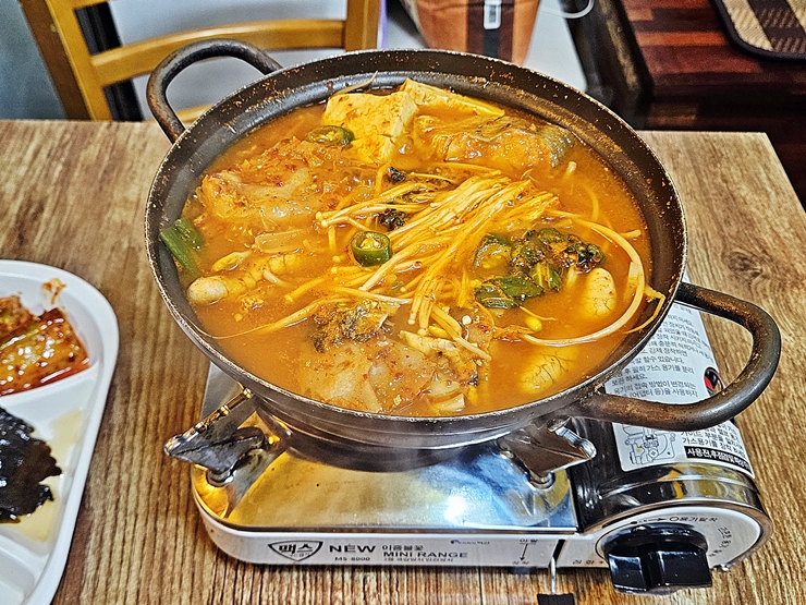 빠르게 나온 동태탕. 2인분을 주문했는데 양이 상당하다. 동태만 들어있을 거라 생각했는데 알도 조금 들어 있었다. 그 밖에 두부, 팽이 버섯과 파 등도 풍부하게 들어있다. 이런 동태탕은 끓이면 끓일수록 맛있기 때문에 약한 불로 조절한 후 계속 끓이며 먹기로 했다.