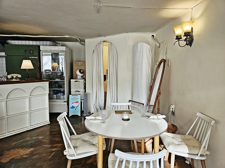 내부는 그리 넓지 않다. 네 테이블이 있었고 좌석간 거리는 제법 넓었다. 초기에는 흰색이었는데 색이 바란 것인지, 아니면 원래 아이보리 색으로 꾸민 것인지는 잘 모르겠지만 이런 색상이 마음을 포근하게 한다. 예약제로 운영 되기 때문에 우리가 들어갔을 때 전 좌석에 고객이 들어왔다.