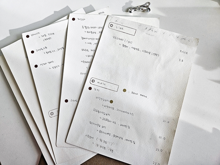 메뉴. 로우파이테이블은 브루스케타, 뇨끼와 해산물 스튜가 유명하다. 그렇다면 유명한 메뉴를 전부 즐기는 것이 돼지의 기본 덕목이자 소양이라 할 수 있다. 다른 테이블은 무엇을 주문하는지 보고 싶었는데 우리의 주문이 제일 빨라서 미처 확인할 수 없었다.