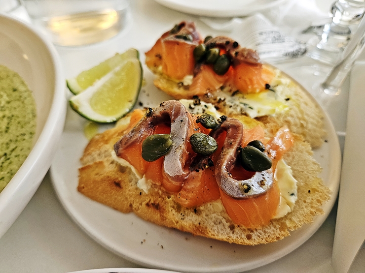 브루스케타. 브루스케타는 납작하게 잘라 구운 빵 위에 각종 재료를 얹어 먹는 요리다. 보통 전채 요리로 먹는 경우가 많고, 대부분 바게트를 사용한다. 올라가는 재료는 각 가게마다 차이가 있고, 제철 재료를 사용한다. 로우파이테이블은 연어와 아보카도를 올렸다. 연어와 아보카도이 맛이 잘 어울린다. 전채로 먹기 딱 좋은 음식이었다.