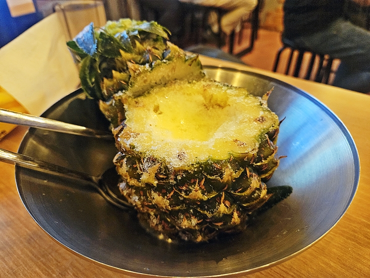 파인애플 샤베트. 맨 정신이라면 절대 주문하지 않을 메뉴이지만, 나와 지인 모두 어느 정도 술이 들어갔기 때문에 주문을 했다. 학생 시절 미팅할 때 이런 샤베트를 참 많이 먹었는데. 그때의 기억을 되살려 먹어봤지만 맛은 그냥 그랬다.