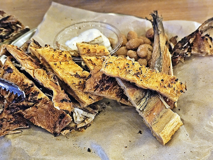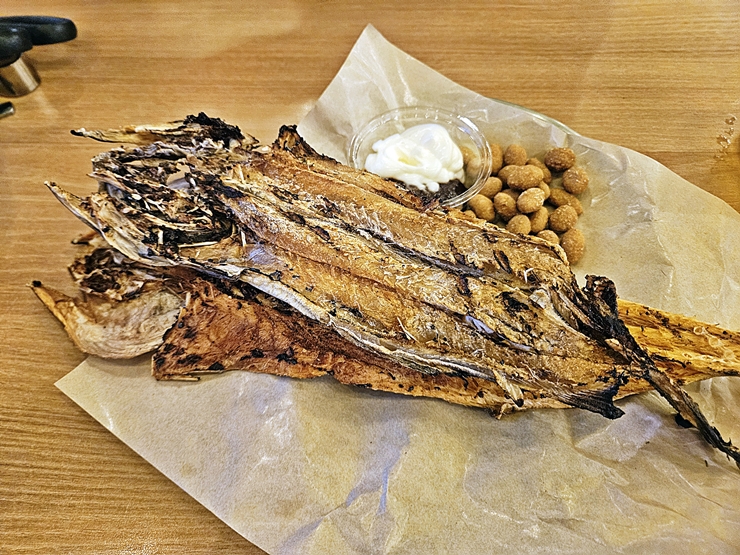 먹태. 배가 많이 불러서 후라이 같은 튀김은 주문하지 못하고 가벼운 것들만 주문했다. 먹태는 명태를 사용해서 황태를 만들 때 살짝 등급이 떨어지는 것을 말한다. 등급이 떨어지더라도 외관에 문제가 있지, 맛에는 문제가 없기 때문에 이런 맥주집에서 많이 판매하고 있다.
