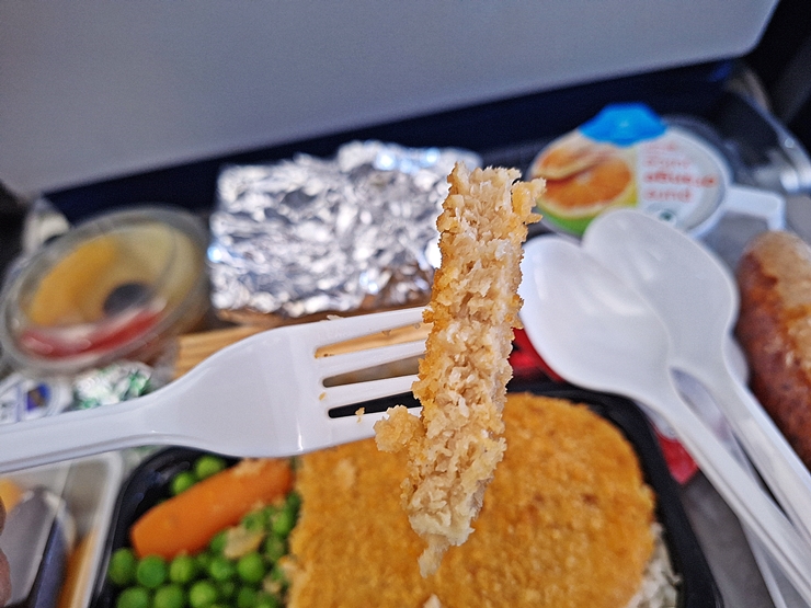 메인 음식을 개봉하니 완두콩, 당근, 튀기지 않고 쪄서 만든 커틀릿과 쌀밥이 나온다. 쌀밥의 경우 자포니카가 아닌 인디카로 나온다. 이때 뭔가 싸함을 느꼈지만 그래도 경험 삼아 한 번은 먹어봐야지.