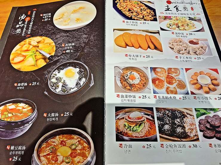 우리나라 사람이 많은 강남4구이기 때문에 한국 요리와 중국 요리를 판매하고 있다. 한국 요리의 경우 우리나라에서 흔히 접하는 것은 아니고 조선족들이 주로 먹는 것들 위주로 되어 있다. 어떤 것을 고르더라도 실패하는 법이 없는 곳이니 먹고 싶은 것들을 시키는 것이 좋다.