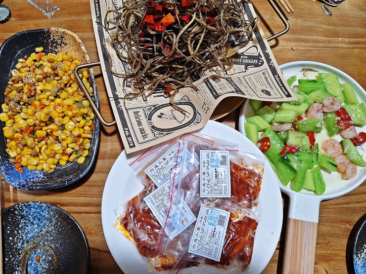 처음으로 나온 옥수수 볶음. 옥수수, 해바라기 씨, 호박, 당근과 깨 등 다양한 곡물에 설탕을 넣어 달달하게 볶았다. 이런 달달한 요리는 소주, 맥주와 백주 등 다양한 술과 잘 어울리지.