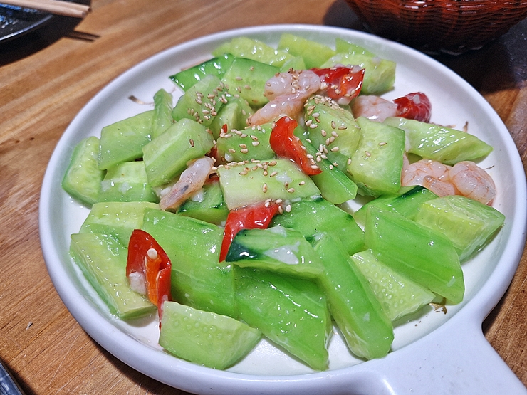 새우 오이 볶음. 새우, 오이와 고추를 넣어 볶은 요리다. 오이가 굉장히 따뜻하게 나오는데, 지금도 따뜻한 오이는 잘 적응이 되지 않는다. 맛은 좋았지만 손이 자주 가진 않았다.