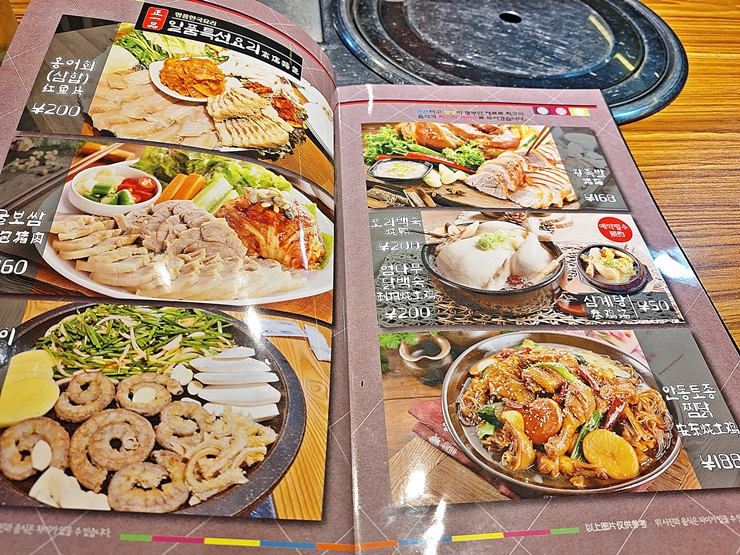 홍어 회, 곱창 구이, 삼겹살, 제육볶음, 잡채, 삼계탕과 찜닭 등 다양한 우리나라 요리를 판매하고 있고, 건두부 볶음, 양배추 볶음, 쏸차이 볶음 등 중국 요리도 판매하고 있다. 가급적이면 중국 요리 위주로 먹고 싶었지만 피로를 회복하고 편하게 식사를 하고 싶어서 메뉴 선택권을 법인장에게 넘겼다.