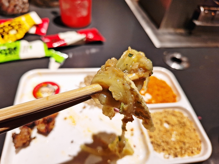 내부 한 편에는 셀프로 반찬과 소스를 가져갈 수 있는 리필 바가 있다. 고기를 먹을 때 채소를 먹으면 고기를 그만큼 많이 먹지 못하기 때문에 채소는 어느 정도 적당하게 먹는 것이 중요하다. 고기를 먹을 때는 온전히 고기에 정신을 집중해야 한다.