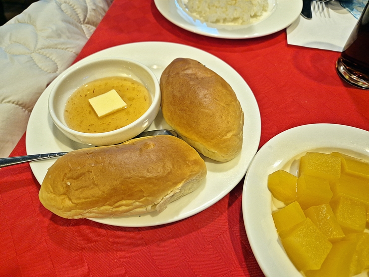 빵. 빵과 밥 중에서 고를 수 있는데 난 빵을 고르고 함께 간 일행은 밥을 골랐다. 이런 경양식당에서 빵은 보통 모닝빵이 나오는데 함지 레스토랑의 빵은 모닝빵 같은데 좀 길쭉한 모양으로 나왔다. 이런 빵에는 잼과 버터가 함께 나온다. 버터를 잼에 섞어서 빵에 발라 먹으면 참으로 맛있지. 흔히 먹을 수 있는 평범한 맛인데 왜 경양식당에 오면 이런 것들이 이렇게 맛있는지 모르겠다.