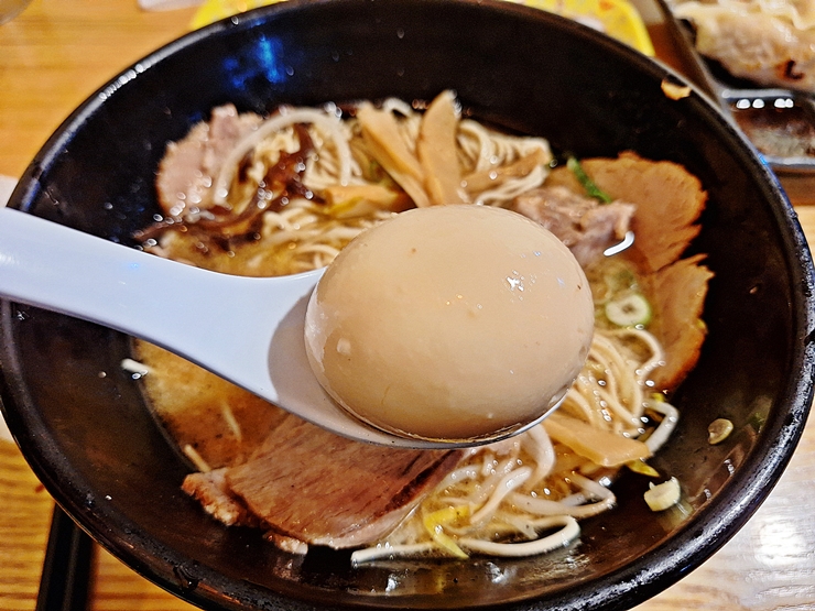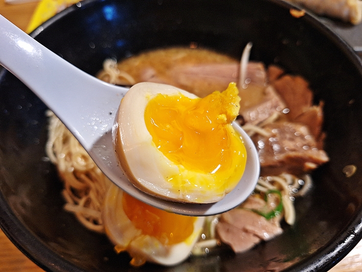 계란. 계란은 완숙이나 온천 계란이 아닌 반숙 계란이 들어간다. 국물 맛을 흐트러지게 하고 싶지 않을 경우 계란을 한 입에 먹으면 되고, 국물의 맛이 변해도 상관 없으면 반으로 갈라 먹으면 된다.