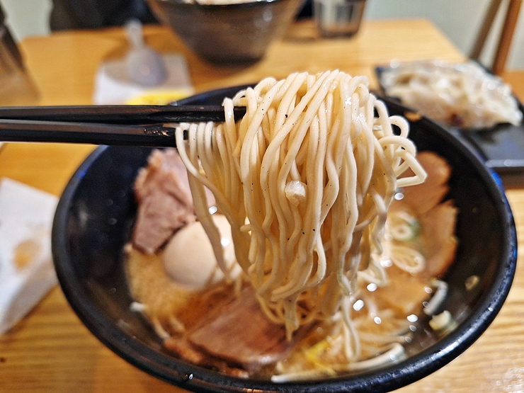 면은 취향에 맞게 익힐 수 있는데 꼬들 꼬들한 면, 그냥 면과 퍼진 면으로 구분이 된다. 난 면을 꼬들꼬들하게 먹는 편이어서 꼬들꼬들한 면을 주문했다. 꼬들꼬들한 면의 경우 면에 심지가 살아있기 때문에 호불호가 갈린다. 꼬들꼬들하게 삶았지만 면이 국물을 흡수하기 때문에 시간이 지나면 좀 퍼진다. 면과 국물의 조화가 훌륭해서 맛있게 먹었다.