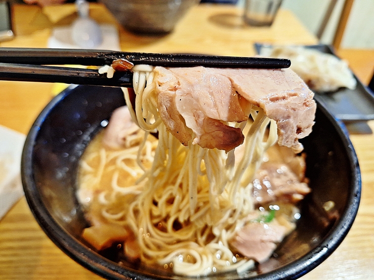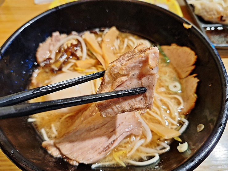 면과 차슈를 함께 먹으면 더욱 맛있게 먹을 수 있지. 라멘은 나트룸 함량이 높고 탄수화물 비중이 높기 때문에 몸에 좋지 않은 음식이긴 하지만 가끔 이렇게 먹으면 괜찮다.