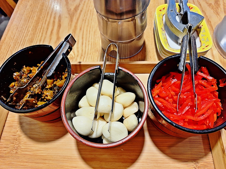 굉장히 매운 김치, 마늘과 베니쇼가. 마늘은 국물에 넣어 먹으면 맛의 변화를 이끌 수 있고 매운 김치와 베니쇼가는 입 안을 개운하게 하기에 좋다.
