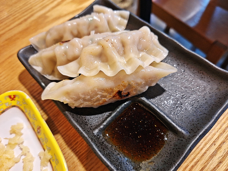 교자. 교자는 4개가 나오는데, 일본 라멘 가게나 이자카야에서 파는 것처럼 나올 줄 알았는데 그냥 평범하게 나왔다. 한쪽은 굽고 다른 한쪽은 찌는 스타일이다.