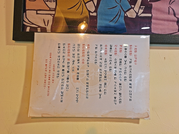 라멘에 대해 자세히 설명을 적은 종이가 있어서 쉽게 이해가 간다. 처음 라멘이 유행했던 시절에는 이런 설명 없이 단순히 메뉴 이름만 걸어둬서 뭐가 뭔지 모르던 시절도 있었다. 메뉴에 대해 설명을 부탁하면 화를 내는 사람도 있었지. 이제 그런 가게는 거의 다 망하고 없다. 꼴 좋다. 본인 요리에 대한 프라이드를 갖춘 장인 정신도 중요하긴 고객들에게 친절해야 하는 것이 더 중요하다.