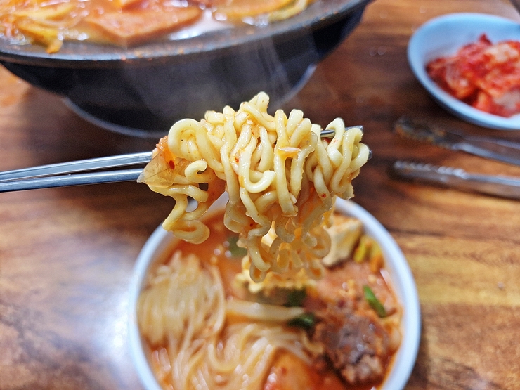 빠르게 쫄면을 먹도록 한다. 부대찌개 국물을 듬뿍 흡수한 쫄면은 부드럽고 전혀 질기지 않다. 부드럽게 잘 씹히는 쫄면에 부대찌개 국물 맛이 느껴지니 면을 잘 먹지 않는 나도 맛있게 잘 먹었다.