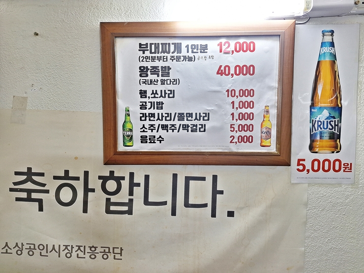 메뉴. 부대찌개와 족발을 판매하고 있다. 부대찌개는 2인분부터 가능하다고 하며 족발은 앞다리를 사용한다고 한다. 그 밖에 햄, 소시지 사리, 밥, 라면, 쫄면 사리, 소주, 맥주, 막걸리와 음료수를 판매하고 있다. 우리는 부대찌개를 주문했지.