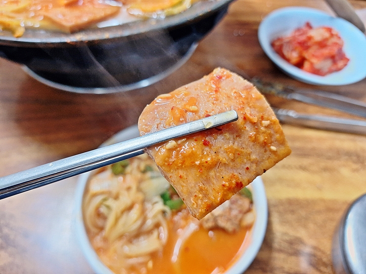 런천 미트가 아닌 스팸이 들어간다. 런천 미트도 맛이 좋긴 하지만 돈육 함량이 스팸을 따라갈 수가 없지. 부대찌개에 스팸을 넣느냐, 런천 미트를 넣느냐에 따라 국물 맛이 확연하게 바뀐다. 스팸은 그 자체로도 짭짤한 밥 도둑이기 때문에 이렇게 먹으면 도무지 맛이 없을 수가 없지.