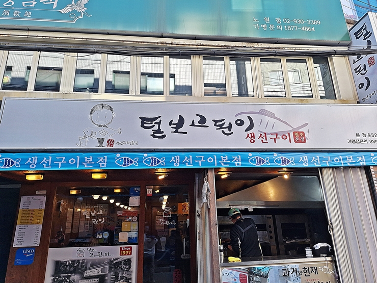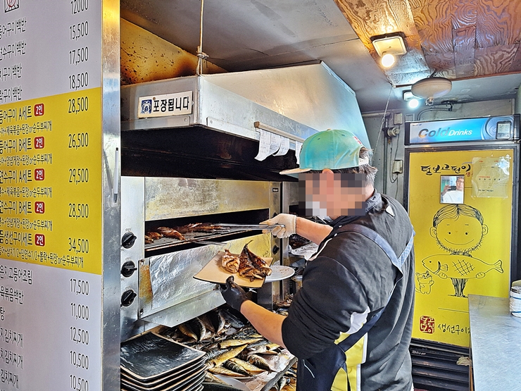 매장 밖에서는 쉼 없이 생선구이를 굽고 있는 모습을 볼 수 있다. 연탄불이 아닌 그릴로 생선을 굽는데 이렇게 구워도 맛이 좋지. 어떻게 구워도 맛있게 굽는다면 그것이 올바르고 바람직한 정도라고 할 수 있다.