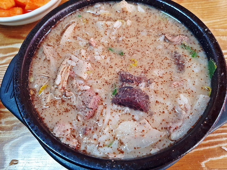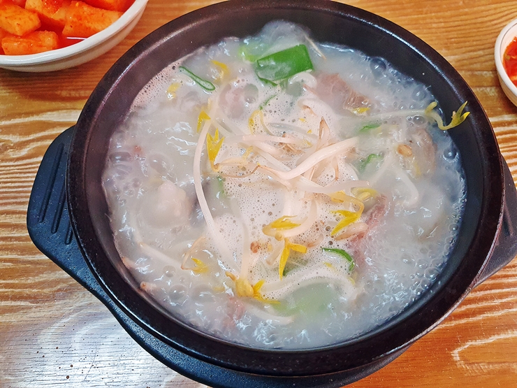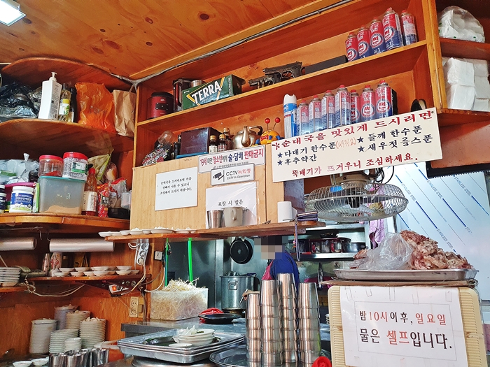 내부에는 워낙 많은 고객들이 있어서 사진을 찍지 못하고 주방을 찍었다. 세미 오픈 형식으로 되어 있는 주방은 요리하는 모습을 볼 수 있다. 산더미 같이 쌓여있는 머릿고기와 숙주가 인상 깊다. 주방 벽에는 순댓국을 맛있게 먹는 방법이 적혀 있다. 난 매운 음식을 잘 먹지 못하는 편이기 때문에 양념장은 넣지 않고 들깨 가루, 새우젓과 소금으로 간을 하는 편이다.