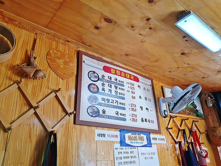 메뉴. 순댓국, 순대탕, 육개장, 내장탕, 머릿고기와 술국을 판매하고 있다. 메뉴에는 없지만 점심 한정으로 제육볶음도 판매한다. 주류는 카스, 소주와 청하가 있고 술을 못 마시는 고객을 위해 음료수도 판매한다. 점심에 식사를 했기 때문에 술은 따로 마시지 않았다. 순댓국에는 순대, 머릿고기와 내장 등이 들어가고, 순대탕에는 순대만 들어간다는 차이점이 있다. 난 순댓국 보통 사이즈를 주문하고 일행은 순댓국에서 순대를 빼고 주문했다.