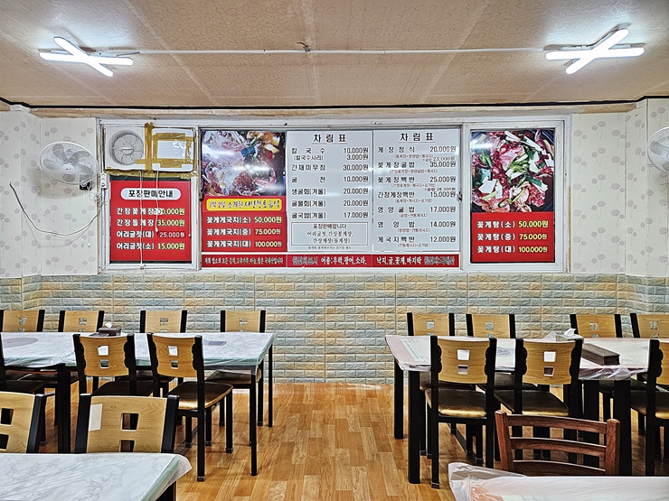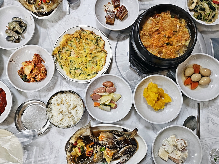 푸짐한 한 상이 바로 차려졌다. 가지, 김치, 전, 묵, 잡채, 게국지, 메추리알 조림, 호박, 굴젓, 사라다와 간장게장 등이 나온다. 간장게장은 한 사람 당 한 마리가 나온다.