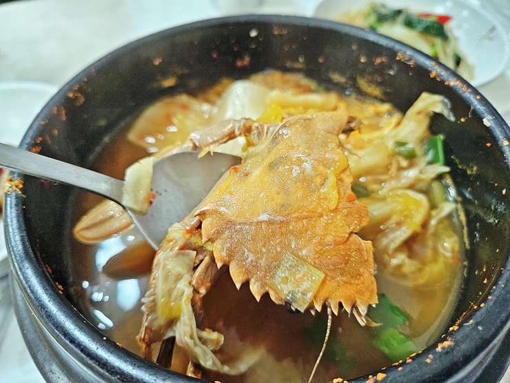큼직한 게가 들어 있어서 시원한 맛이 강하다. 거기에 김치가 더해지니 더더욱 시원한 맛이 나지. 이런 탕에는 소주 한 잔 걸쳐야 하지만 운전을 해야 하기 때문에 술은 마시지 못했다.