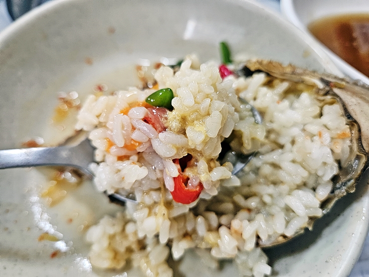 굴젓을 올려서 밥도 맛있게 냠냠. 개인적으로 굴젓을 즐겨 먹지 않는 편이지만, 이렇게 맛있게 보이는 굴젓을 도무지 그냥 지나갈 수 없었다. 비린 맛은 없고 매콤하면서 깊은 풍미가 잘 느껴지는 굴젓이었다.