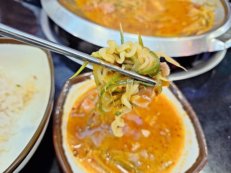 깜빡하고 라면 사진을 못 찍었는데 이렇게 마침 좀 남아 있어서 후식 개념으로 라면으로 마무리했다. 다른 부대찌개에 비해 맑지만 깊은 맛이 나는 특징인 신의주 부대찌개. 삼각지에서 맛있는 부대찌개를 먹고 싶다면 한 번 가볼 것을 추천하는 곳이다.