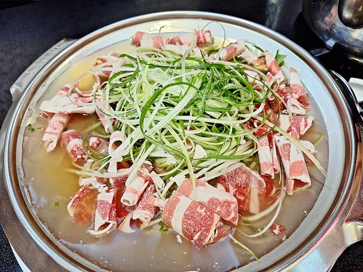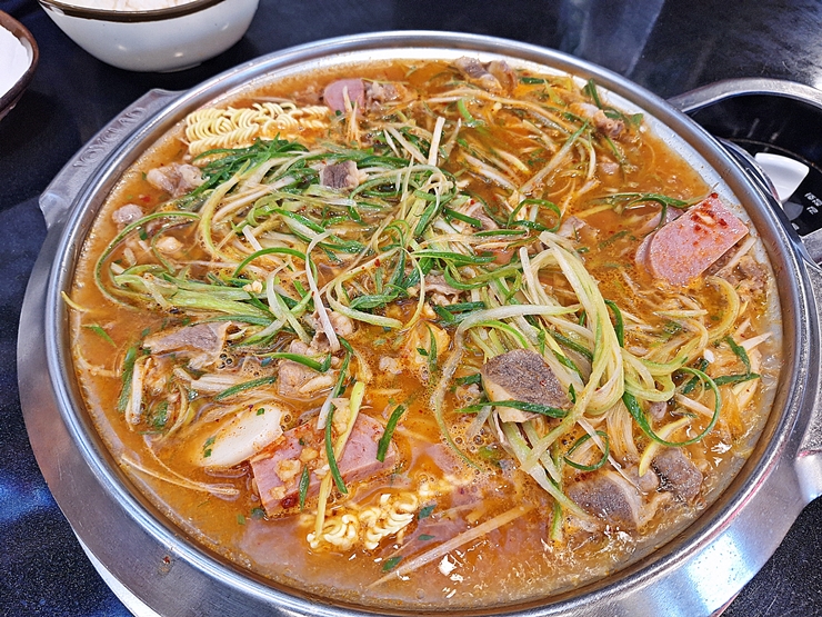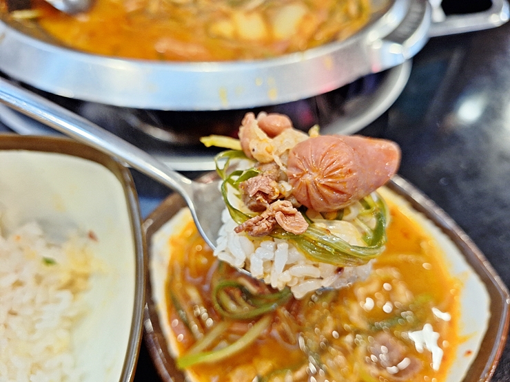 빠르게 나온 부대찌개. 부대찌개에는 스팸, 소시지, 우삼겹살, 떡과 파 등이 수북하게 들어간다. 부대찌개에 우삼겹살이 들어가는 것이 생소해 보일 수도 있지만 한 번 이 맛에 익숙해지면 나도 모르게 찾게 된다. 묘한 매력이 있는 부대찌개라 할 수 있다.
