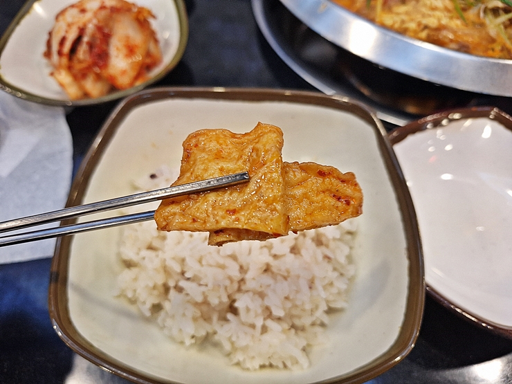 맛있는 부대찌개를 먹고 있으니 평소보다 탄수화물을 조금 더 먹어도 괜찮지. 밥에 국물을 조금 묻힌 후 각종 재료를 얹고 또 맛있게 먹었다.