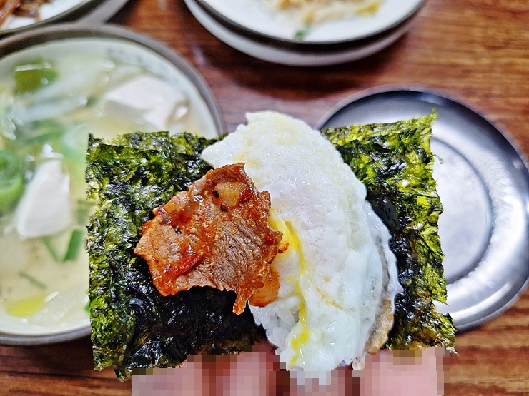 김 위에 밥을 올리고 계란 후라이와 제육을 올려서 맛있게 냠냠. 이 조합은 가히 최강이라 할 수 있는 환상의 조합이다. 이렇게 먹는데 맛이 없으면 그게 반칙이지.