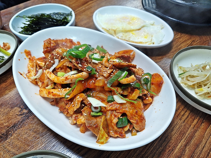 아름다운 모습의 오징어 제육. 양파, 양배추 같은 것은 거의 들어 있지 않고 돼지고기와 오징어가 주를 이룬다. 참으로 올바른 오징어 제육이 아닐 수 없다. 이런 오징어 제육을 먹을 때 오징어, 제육보다 양파와 양배추가 많이 들어 있으면 굉장히 속이 상한다.
