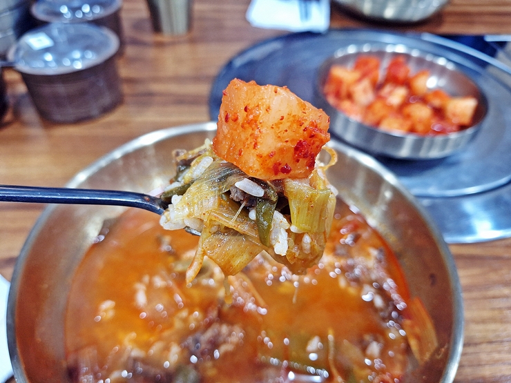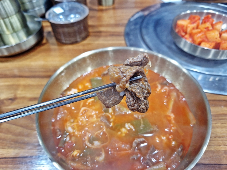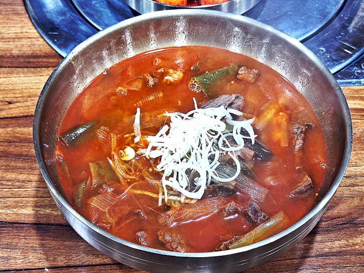 얼큰하게 생긴 해개장. 경상도식 육개장이라고 하는데, 경상도식 육개장은 고사리, 토란대, 대파, 숙주 등 다양한 채소와 찢은 소고기를 고춧가루 양념으로 얼큰하게 끓이는 국이라고 한다. 그런데 고사리나 토란대는 들어가지 않았고 파가 수북하게 들어간 것이 특징이었다. 뭐 경상도가 워낙 넓으니 같은 경상도라도 지역마다 차이가 있겠지.