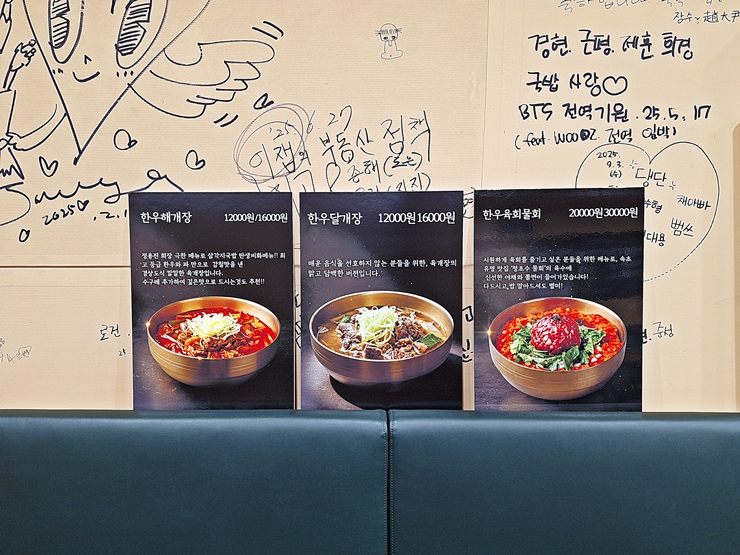지난 번에는 한우 달개장을 먹었으니 이번에는 해개장을 먹기로 했다. 해개장은 경상도식 육개장이라고 하는데 어쩌고 저쩌고가 들어가서 시원하면서 칼칼한 맛이 난다고 한다. 매운 음식을 잘 먹지 못하는 나지만, 이럴 때 도전 한 번 해봐야지.