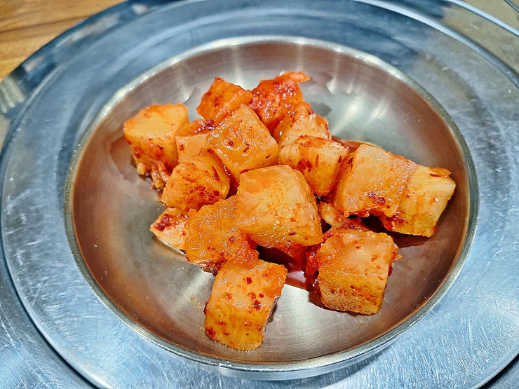 지난 번과 동일하게 유일한 반찬인 깍두기. 이번에는 지난 번에 비해 조금 더 익은 느낌이었다. 지난 번에도 느꼈지만 국밥에 깍두기만 나오는 것은 좀 놀랍다. 국밥 맛에 자신이 있어서 그런 것 같지만 김치도 나오면 더 좋겠다.