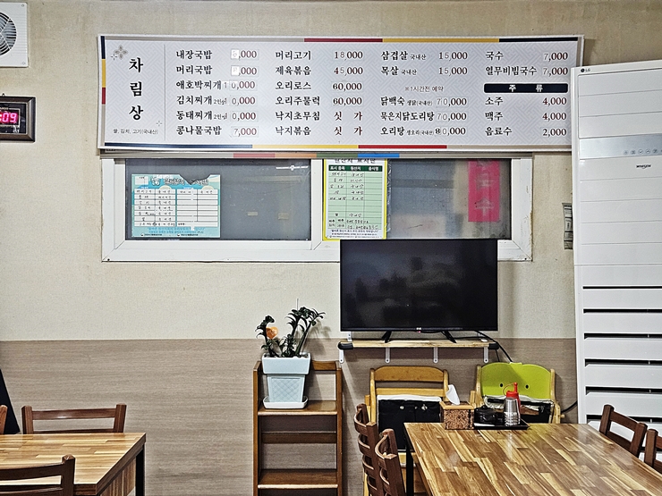 메뉴. 내장국밥, 머리국밥, 애호박찌개, 김치찌개와 동태찌개 같은 찌개류를 판매하고, 제육볶음과 오리고기 같은 술 안주도 판매하고 있다. 제육볶음 가격이 상당한 것을 보니 밥 반찬으로 나오는 것은 아니고 술 안주인 것 같다. 나는 애호박찌개를 주문했다.