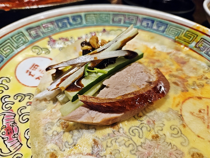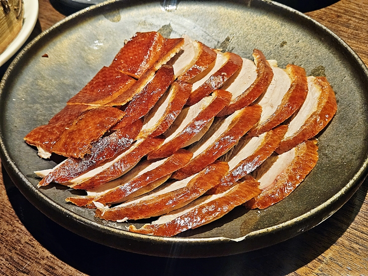 베이징 덕. 참으로 아름다운 모습이다. 베이징 덕은 껍질만 따로 자른 부위와 껍질과 살코기가 함께 붙어 있는 부위로 나눠 제공한다. 베이징 덕은 껍질을 얼마나 바삭하게 만드는 지에 따라 그 수준이 갈린다고 할 수 있다.