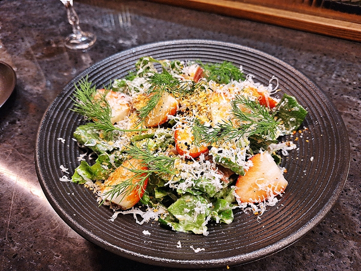 딸기 하몽 시저 샐러드. 시저 샐러드에 딸기와 하몽을 넣은 것이다. 시저 샐러드에 베이컨은 많이 넣기 때문에 하몽은 그렇다 쳐도 딸기가 들어있는 것은 살짝 이해가 가지 않았다. 시저 드레싱의 묵직함이 딸기와 잘 어울릴까 싶기 때문이었다. 하지만 나보다 요리에 대한 조예가 높은 사람이 만들었으니 과감히 먹어보기로 했지.