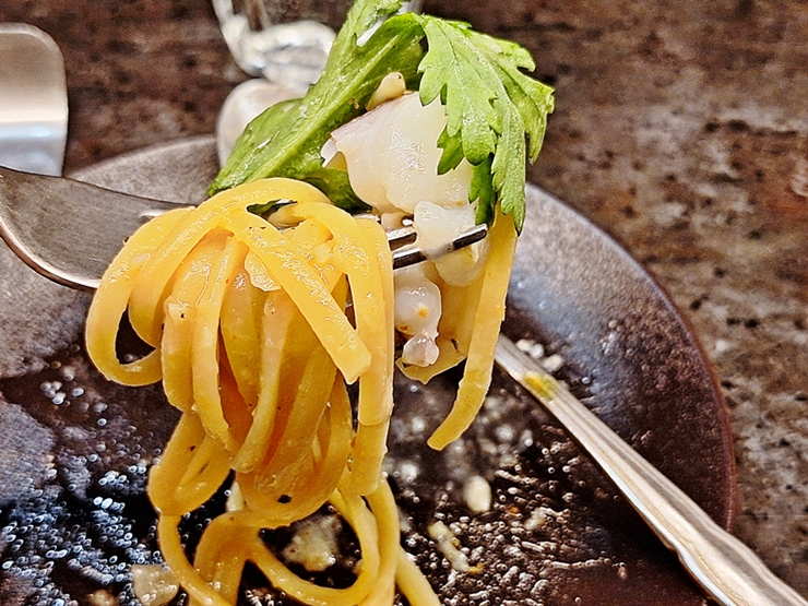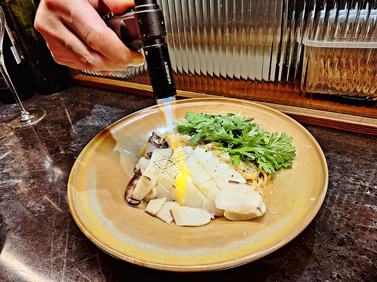 갑오징어 파스타. 갑오징어 파스타는 먼저 요리를 제공한 후 토치로 갑오징어 겉을 빠르고 강하게 그을려준다. 이렇게 그을리면 더욱 고소한 맛을 느낄 수 있지.