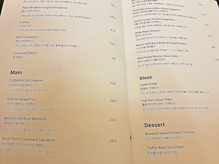 메뉴. 다양한 샐러드, 파스타, 스테이크와 디저트를 판매하고 있다. 우리는 딸기 하몽 시저 샐러드, 갑오징어 파스타와 고등어 세비체를 주문했다.