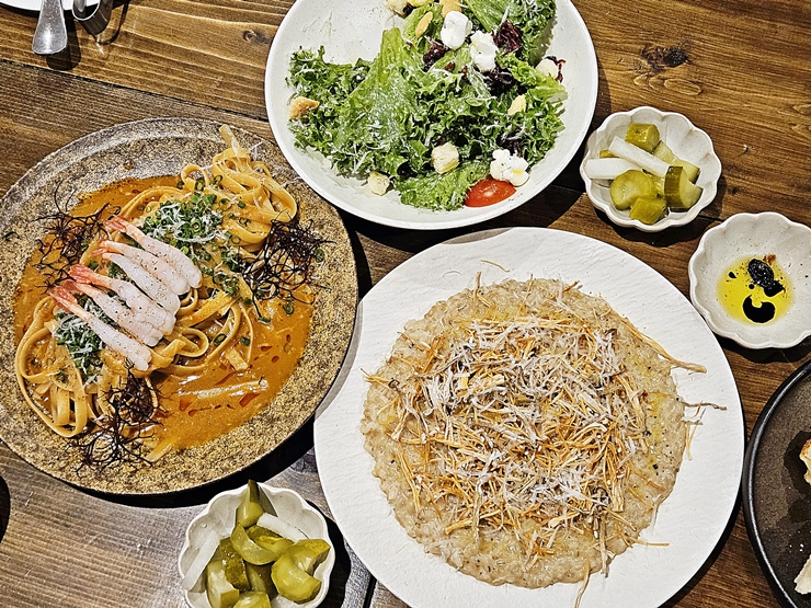 비스크 파스타. 새우 등의 갑각류 대가리와 내장을 으깨고 갈아 만든 소스에 파스타를 잘 버무렸다. 새우는 제주산 딱새우를 사용했다고 한다. 갑각류 특유의 고소하면서 녹진한 맛이 잘 우러나와서 맛이 좋았다. 탄수화물을 최대한 적게 섭취하려고 했지만 연말이니 먹어도 된다.