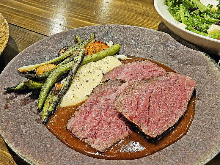 수비드 살치살 스테이크. 가니쉬로 줄기콩, 매시드 포테이토와 어쩌고 등이 함께 나왔다. 수비드한 살치살은 풍미가 상당히 강했는데, 살치살에 녹아 있는 지방이 잘 녹아서 고기와 잘 어울렸다. 굽기도 상당히 좋아서 먹는 내내 행복했다.