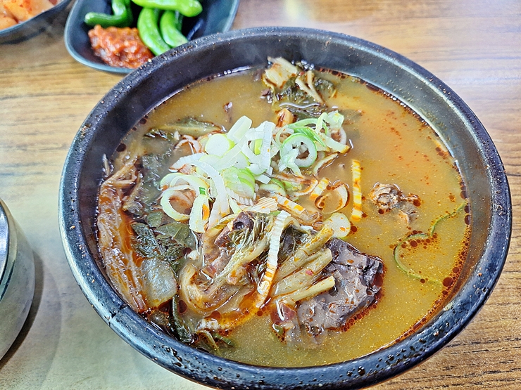 단일 메뉴인 해장국. 용문해장국의 해장국에는 소뼈, 우거지와 선지가 들어간다. 단일 메뉴이기 때문에 주문을 하면 굉장히 빠르게 나오는 편이다.