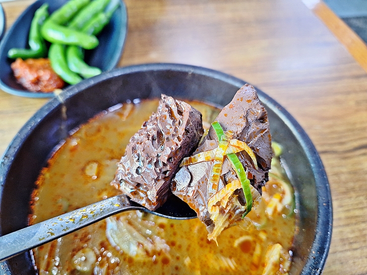 부드럽고 고소한 맛이 일품인 선지. 선지는 오래 삶거나 보관을 잘못하면 섬유화가 진행 되어 질겨지고 맛이 극도로 떨어진다. 용문해장국의 해장국에 들어있는 선지는 그런 질이 좋지 않은 선지가 아닌 굉장히 수준 높은 선지다.
