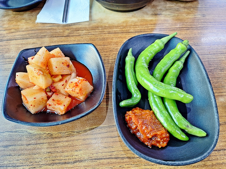 반찬으로 나온 깍두기와 고추. 고추가 매워 보여서 따로 먹지 않았고 깍두기만 먹었다. 깍두기는 적당히 익어서 시원한 맛이 참 좋았다. 이런 깍두기는 국밥과 참 잘 어울리지.