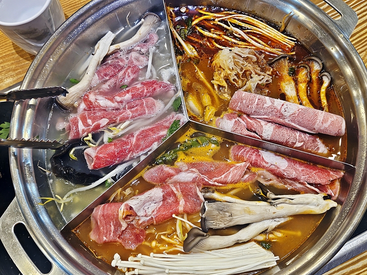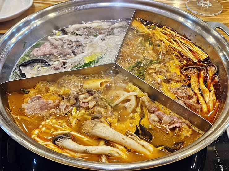 맛있게 잘 끓고 있는 훠궈. 훠궈에 들어간 양고기와 소고기는 굉장히 얇기 때문에 금방 익는 편이다. 양고기와 소고기는 오래 굽거나 익히면 굉장히 질겨지기 때문에 샤브샤브처럼 붉은 기운이 없어지면 바로 먹는 것이 좋다.