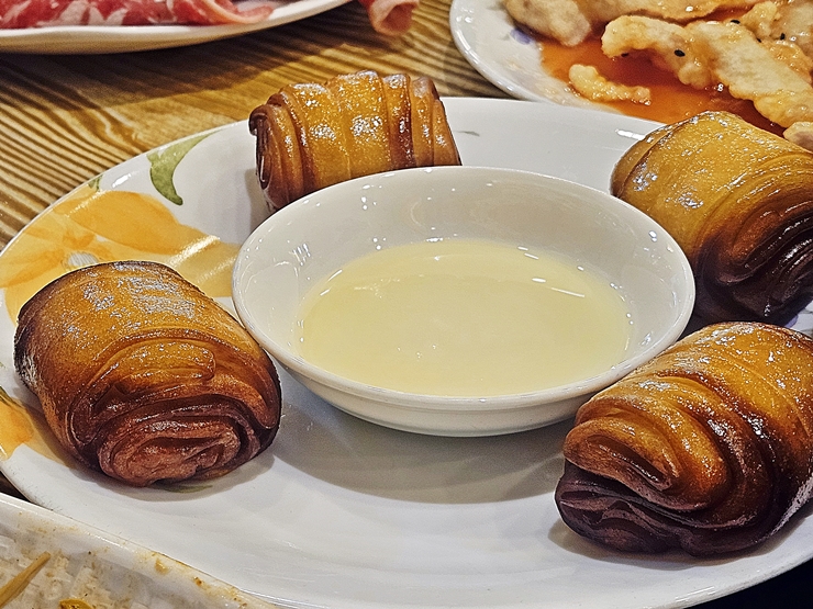살짝 보이는 꿔바로우와 튀긴 꽃빵. 꿔바로우는 상당히 잘 튀겼고 소스도 많이 시지 않아 좋았다. 튀긴 꽃빵은 후식 개념으로 먹으면 맛있지. 연유와 함께 제공 되는데 개인적으로 연유는 달아서 먹지 않는 편이다. 그래서 일행들은 연유에 찍어 먹었고 난 지삼선을 올려 먹었다.