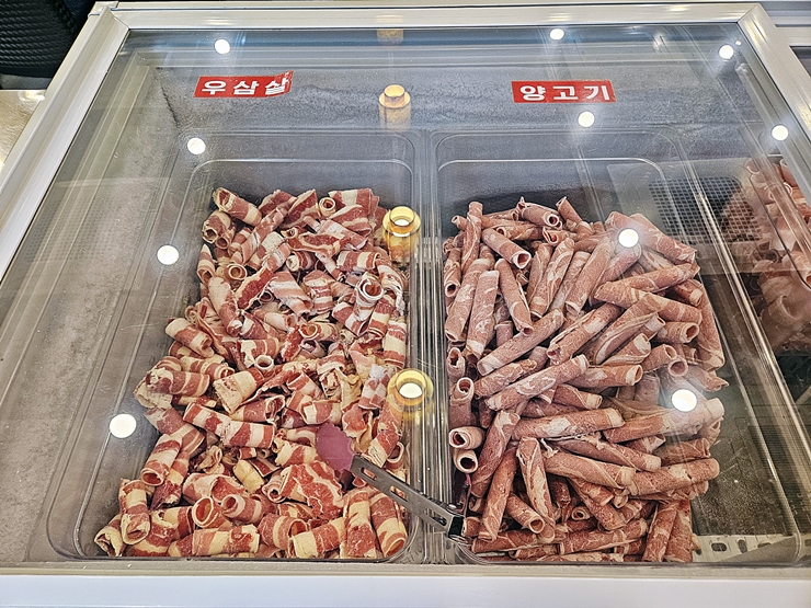 비록 냉동이지만 아름다운 고기. 고기는 냉장이어도 아름답고 냉동이어도 아름답다. 고기는 소고기와 양고기가 준비 되어 있는데 취향에 따라 먹으면 된다. 물론 두 가지 모두 먹는 것이 더 다채롭게 맛을 즐길 수 있는 방법이다. 사진에는 양고기만 나왔지만 소고기도 가지고 왔다.