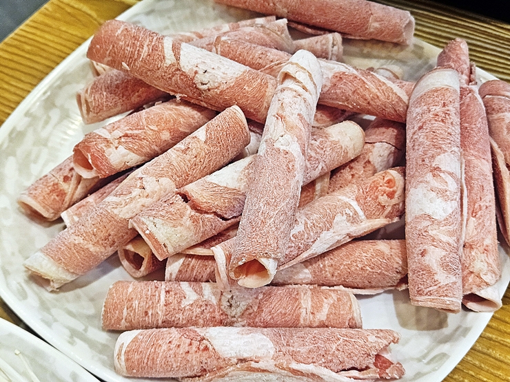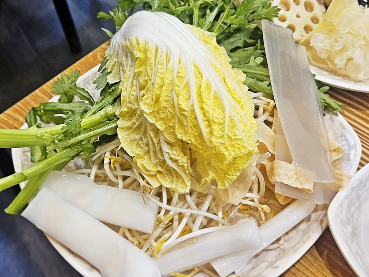 훠궈의 메인이라고 할 수 있는 채소. 양배추, 쑥갓, 콩나물, 당면, 목이 버섯과 연근 등을 푸짐하게 가지고 왔다. 난 평소 채소보다 고기를 많이 먹는 편인데, 이상하게 훠궈를 먹을 때는 고기보다 채소를 더 많이 먹게 된다.